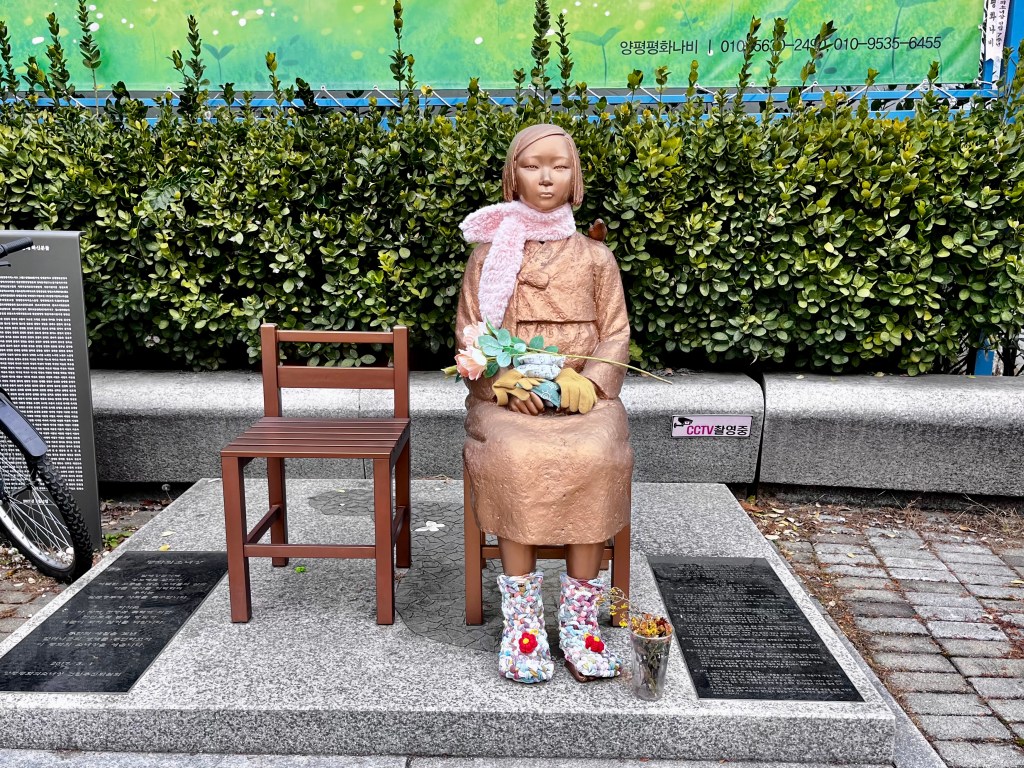 평화의 소녀상이 예쁜 털신과 목도리를 두르고 있었어요. 누군지는 몰라도 장갑과 핫팩도 손 위에 두고 갔더라고요.