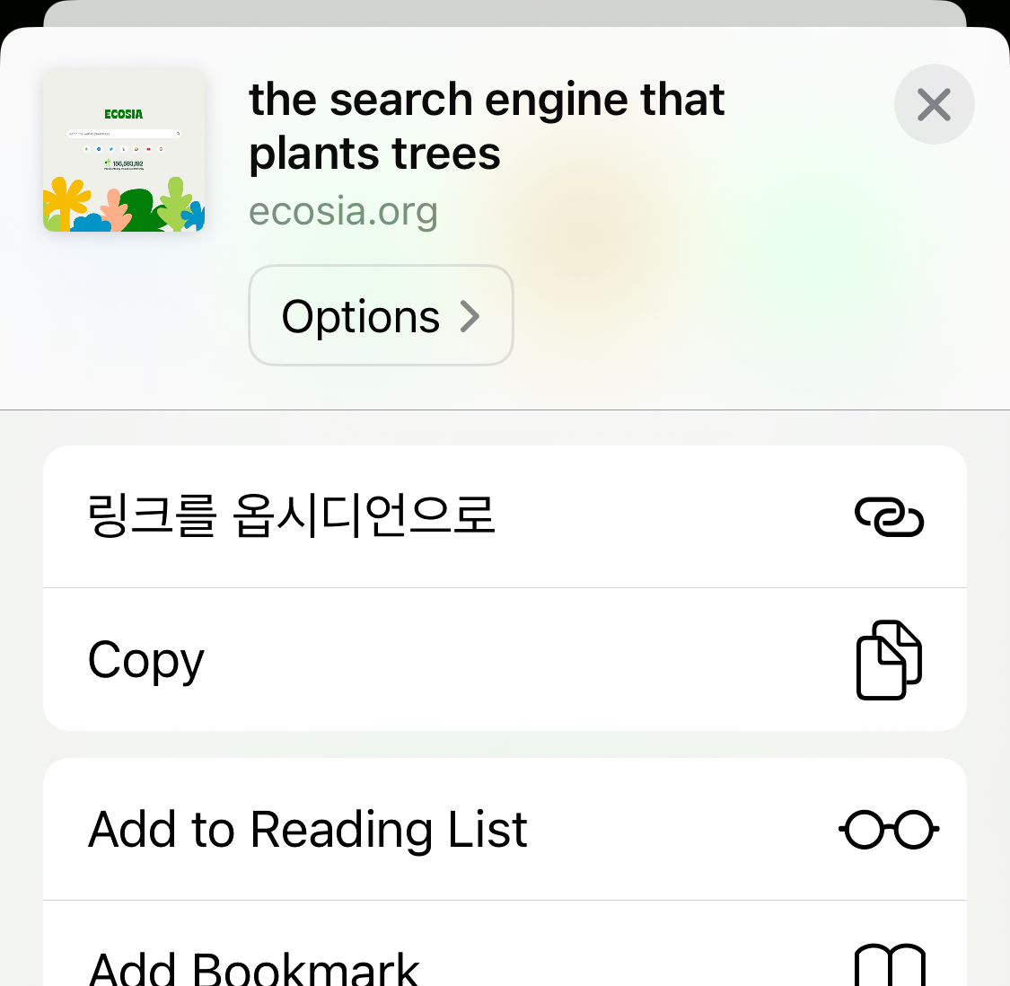 - 브라우저에 있는 ‘공유하기’ 버튼을 눌러 공유 메뉴를 띄웁니다