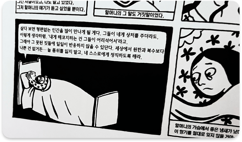 비엔나로 향한 마르잔은 가족에 대한 그리움, 보호자의 부재, 또래와의 복잡한 관계 등으로 점철된 어려운 10대를 보냅니다. 혁명 때문에 가족과의 단란한 삶을 잃고 혼란의 시간을 보내게 된 마르잔을 보면서, 이란을 떠나서 다행이었는지 아니었는지는 알 수가 없었습니다. 평온한 이란에서 현명하고 재치있는 할머니 가까이 오래오래 살았을 마르잔을 상상해봅니다.