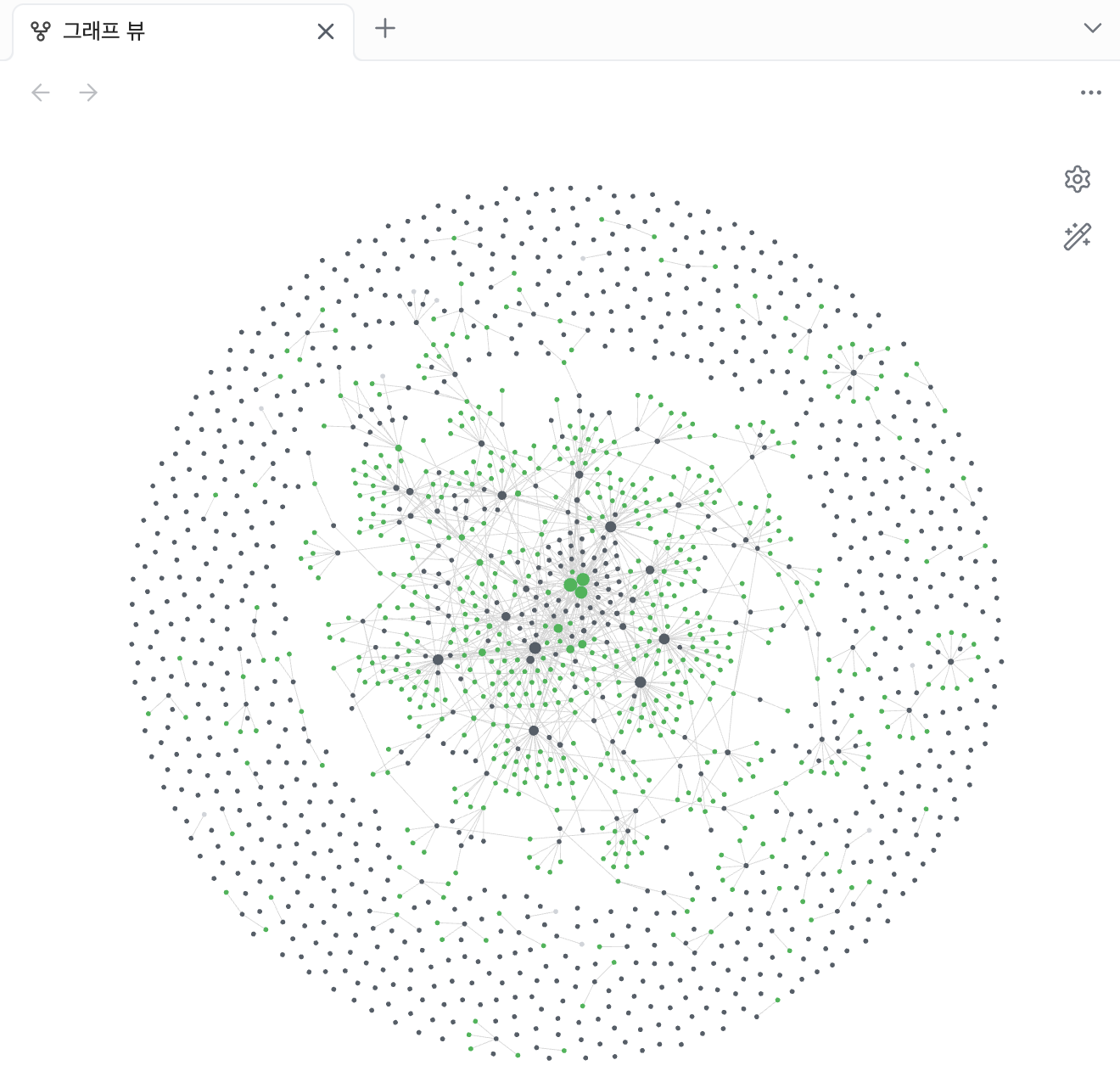 정답은 그래프뷰에 있습니다. 옵시디언은 쓴 글과 관련 해시태그 등을 모아서 점으로 보여줍니다. 관련있는 내용은 선으로 연결하고, 많이 쓰인 주제일 수록 큰 점으로 나타냅니다. 아래는 제가 쓰고 있는 노트의 그래프뷰 입니다. 그간 적어온 생각들이 공통 주제로 모여있는 것이 마치 유기물이 엉켜있는 것 같기도 하고, 밤 하늘의 별을 보는 느낌도 듭니다. 이 기능을 보고 옵시디언을 당장 한 번 써보고 싶은 마음이 강하게 들었죠.