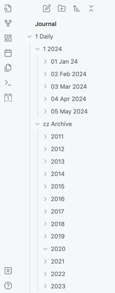 이 이미지는 제 옵시디언 문서 보관소 중 하나의 구조를 캡쳐한 사진입니다. 크고 작은 메모를 2011년부터 연도별로, 또 각 연도 폴더 아래는 월별로 모아 놓았어요.