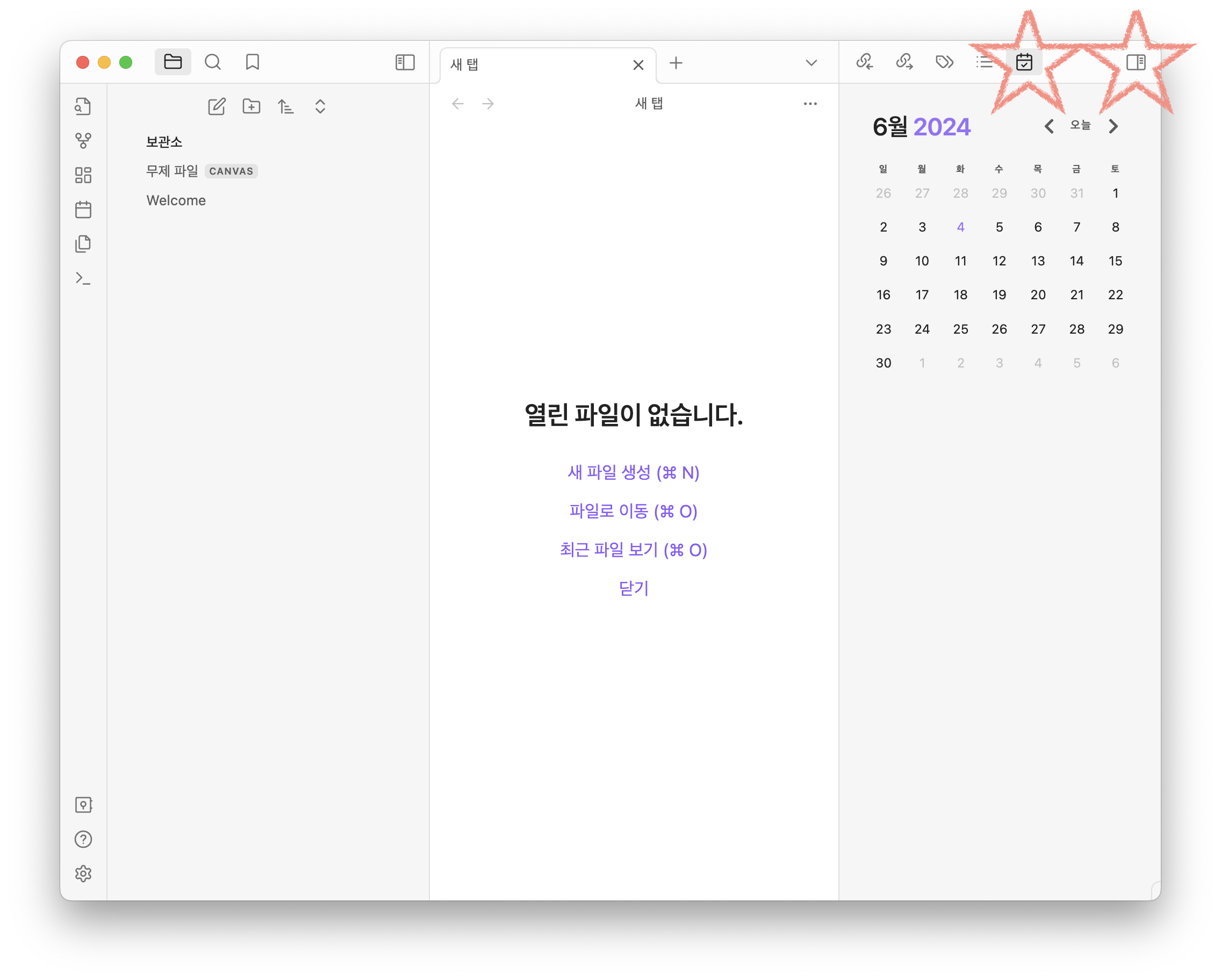 지금까지 옵시디언을 설치하고 문서 작성을 시작하며 달력을 다는 방법까지 알려드렸어요. 여기에 플러그인을 하나 더 꿰어 보배 일기장으로 써볼 거예요.